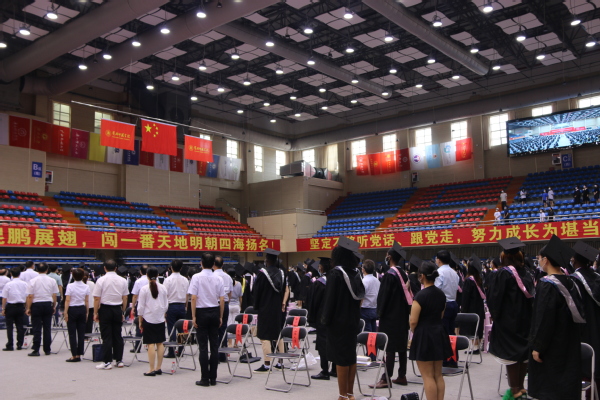 升国旗,奏国歌,用最庄严的仪式见证最难忘的时刻。全体起立,面向国旗,伴随着激昂雄壮的国歌,毕业典礼暨学位授予仪式正式开始。